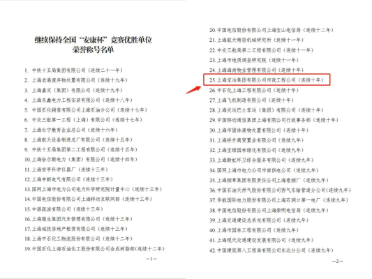 多年来,上海宝冶市政工程公司将“安康杯”竞赛与企业的安全生产有机结合,实现了“安全生产”向“安康生活”的深化,推动“安康”与“和谐”的互动融合。公司围绕“常赛常新、四个确保、员工安康、企业和谐”的原则,通过“安康杯”竞赛活动的开展助力安全生产工作,打造“市政· 家”文化。公司切实做好组织落实、责任落实、思想落实、资金落实工作,运用“五新”工作法,创新竞赛形式,丰富竞赛内容,拓展竞赛内涵;坚持做到把安全挺在最前面、将安康教育全覆盖、让安全文化深入人心,先后获得上海市建交委“文明单位”、“平安单位”荣誉称号,获得“上海市文明单位”、“上海市建交行业建设先锋”、“上海五四奖章集体”、“湖北十堰五一劳动奖状”等称号。